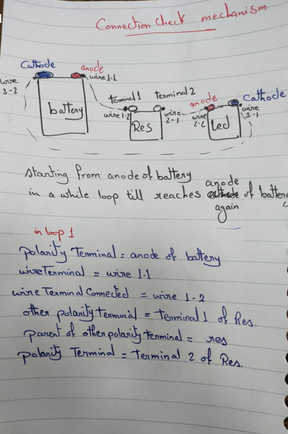 Connection Checking works for any combination of circuit components where it dynamically checks at every node of the circuit to see : 1. if the circuit is connected or not, 2. if the components are connected in correct polarity, 3. if there is a burnt component connected